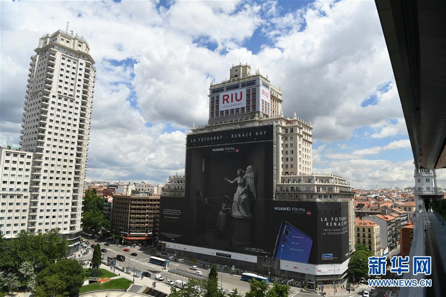 2018年6月12日,位于馬德里市中心的西班牙大廈掛出華為P20 Pro手機(jī)超大幅廣告。新華社記者郭求達(dá)攝