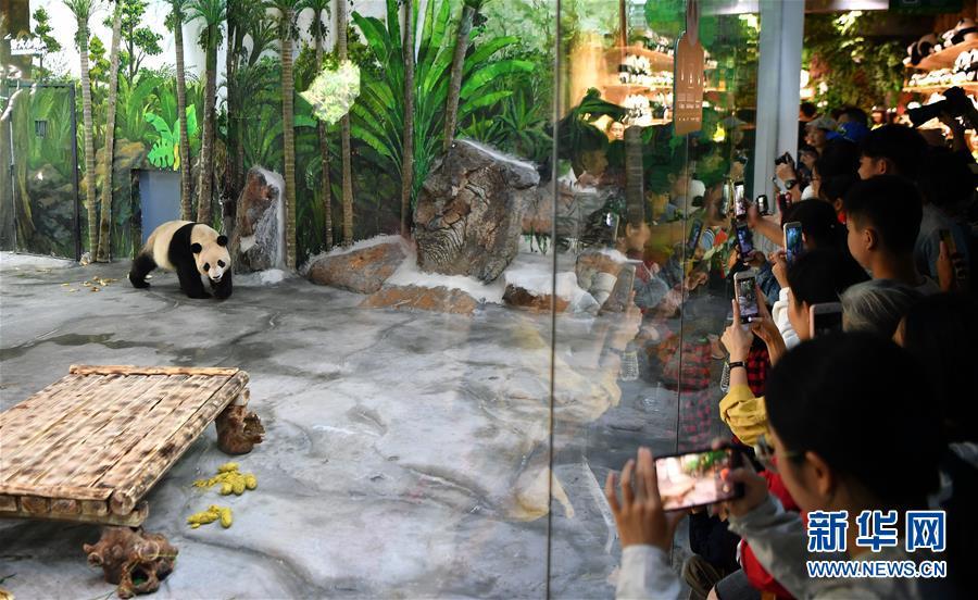 11月25日,游客在海南熱帶野生動(dòng)植物園熊貓館觀看大熊貓“舜舜”。