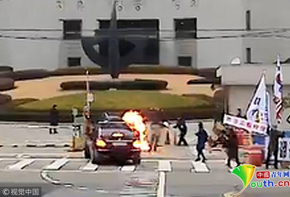 當(dāng)?shù)貢r間2018年11月27日,韓國首爾,27日上午9點(diǎn)10分,在首爾瑞草區(qū)的最高法院前面,一名74歲的示威男子向韓國最高法院院長金明秀所乘的車輛投擲燃燒瓶。副駕駛一側(cè)的前輪和示威男子身上均起火,所幸被現(xiàn)場警察迅速撲滅,金明秀未受傷。當(dāng)時,他正準(zhǔn)備去上班。