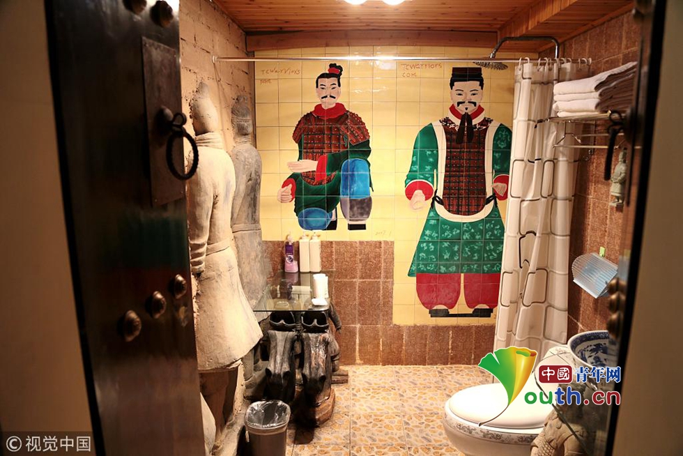 2018年11月27日,西安,民宿臥室內(nèi)的“兵馬俑”裝飾。近日,西安一家主打“兵馬俑”元素的民宿走紅,“兵馬俑”元素遍布在房間各個角落,“深情注視”著在此休憩的旅客,加上昏黃的燈光及復古的裝飾,讓不少旅客感嘆如同居住在“秦始皇陵”。 張遠(陜西分社)/視覺中國