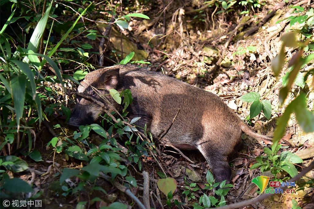 山豬個頭不大,身長1米左右,毛色呈深褐色。從體型判斷,這只山豬應(yīng)該體重在35公斤左右,估計(jì)年齡只有1歲。