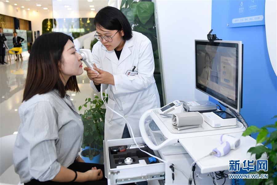 11月6日,參觀者在烏鎮(zhèn)互聯(lián)網(wǎng)醫(yī)院體驗“智能醫(yī)務(wù)室”的體檢功能。據(jù)了解,“智能醫(yī)務(wù)室”由智能移動醫(yī)療一體機(jī)、智能藥柜以及一系列檢查設(shè)備組成,根據(jù)健康檔案和檢查結(jié)果,視頻連接家庭醫(yī)生就能解決常見的醫(yī)療健康問題。 新華社記者黃宗治攝