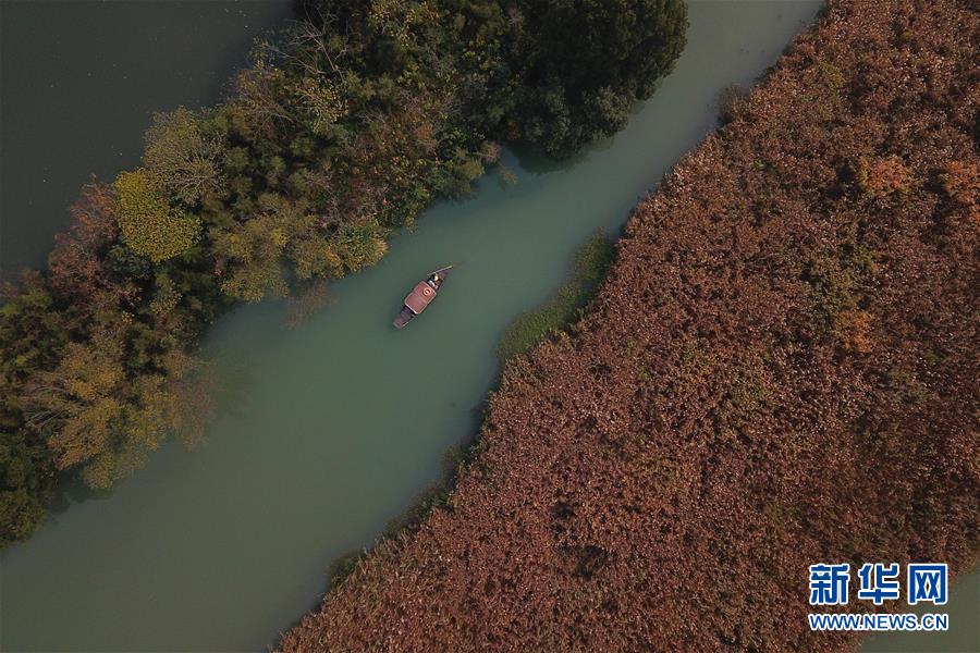 11月30日,游客乘坐搖櫓船在西溪濕地欣賞蘆花(無人機(jī)拍攝)。