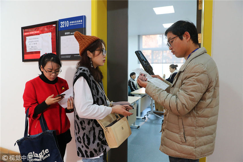 圖為2018年12月2日,浙江寧波,浙江萬里學(xué)院考點(diǎn),監(jiān)考老師在核對考生準(zhǔn)考證、身份證。張培堅(jiān)/視覺中國