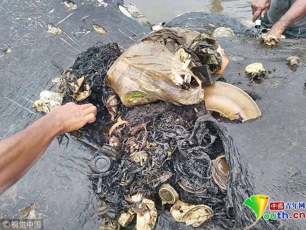 當(dāng)?shù)貢r(shí)間2018年11月19日,印尼瓦卡托比,當(dāng)?shù)匕l(fā)現(xiàn)一頭擱淺的鯨,肚子里滿是塑料垃圾。它的腹中有12斤塑料垃圾,其中包括115個(gè)杯子。