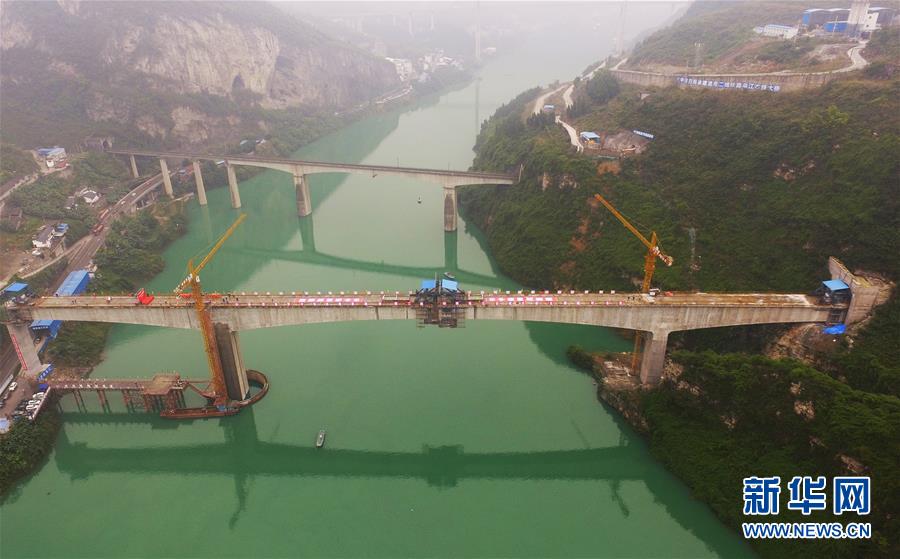 在重慶涪陵拍攝的渝懷鐵路涪秀二線重點工程——烏江右線大橋(10月23日無人機拍攝)。 10月23日,由中鐵四局承建的渝懷鐵路涪秀二線重點工程——烏江右線大橋主跨成功合龍,標(biāo)志著大橋主體工程全部順利結(jié)束。烏江右線大橋項目全程460.1米,主跨192米,跨越烏江和319國道。在兩年多的建設(shè)過程中,施工人員攻克了“不等高墩”“不對稱邊跨”“邊跨入隧”等多個技術(shù)難題。 新華社記者王全超攝