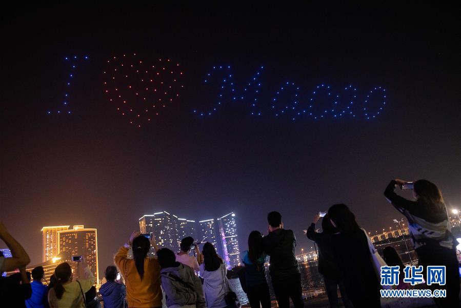12月2日,無人機(jī)在澳門南灣湖水上活動中心進(jìn)行空中圖案表演。 新華社記者 張金加 攝