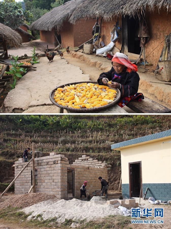 這是一張拼版照片。上圖:12月3日,在云南省瀾滄拉祜族自治縣南嶺鄉(xiāng)勐炳村龍?zhí)独险?1歲的李娜六老人在老宅前剝玉米;下圖:在云南省瀾滄拉祜族自治縣南嶺鄉(xiāng)勐炳村龍?zhí)洞迕裥〗M,李娜六老人的新宅正在建設中(12月3日攝)。 新華社記者杜涓涓攝