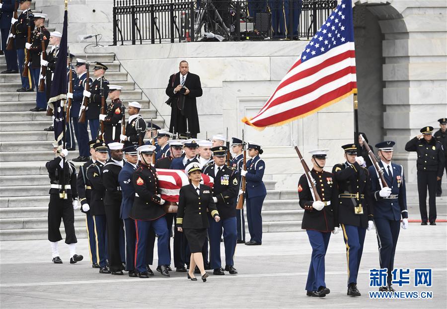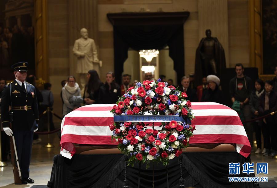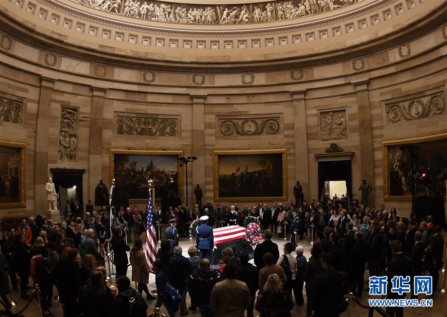 美國(guó)前總統(tǒng)老布什的遺體3日下午運(yùn)抵首都華盛頓,安放在國(guó)會(huì)大廈圓頂大廳,接受吊唁。