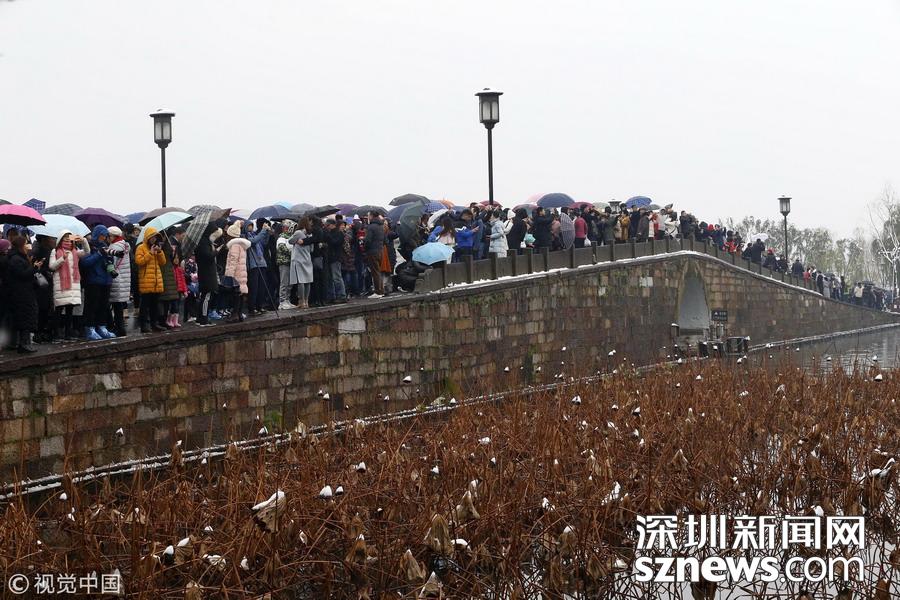 深圳新聞網(wǎng)訊 2018年12月8日,杭州,當日市區(qū)普降大雪,市民和游客扎堆涌入西湖景區(qū),拍攝最美雪景照片以及為自己留影。每次杭州一下雪,斷橋便成為眾多游客欣賞雪景、拍攝雪景的地方,大家都想看看“斷橋殘雪”。游客們扎堆涌入斷橋后,人山人海,讓現(xiàn)場堪比春運場景。因為人太多,雪積不起來,斷橋看不到殘雪。