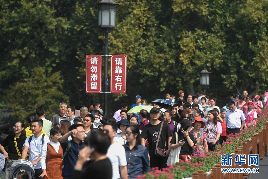 10月7日,游客在杭州西湖風景區(qū)涌金門游覽。當日是國慶黃金周最后一天,眾多游客來到杭州西湖景區(qū)觀光游覽,熱度不減。據(jù)杭州市旅游委員會公布的數(shù)據(jù)顯示,從10月1日起截至10月7日12時,國慶七天杭州市各景區(qū)(點)接待游客總量達到1776.14萬人次,其中西湖風景名勝區(qū)管委會所屬公園景點共接待游客452.2萬人次。新華社記者 黃宗治 攝