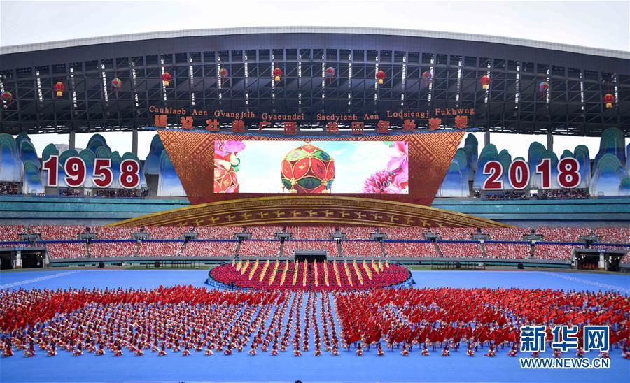 12月10日,廣西壯族自治區(qū)成立60周年慶祝大會在廣西體育中心隆重舉行。這是慶祝大會上的群眾文藝表演。 新華社記者 李學仁 攝