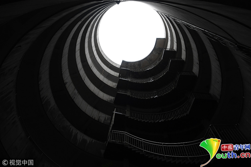 2017年9月27日,重慶,南岸區(qū)某小區(qū)的“螺旋”停車場(chǎng),從公路到車庫(kù)要下5層樓,司機(jī)需要轉(zhuǎn)無數(shù)個(gè)360度圈。圖片來源:視覺中國(guó)