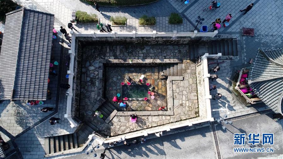 人們?cè)诮饕舜簻販?zhèn)的溫泉泉眼邊打水(2月28日無人機(jī)拍攝)。 新華社記者 彭昭之 攝