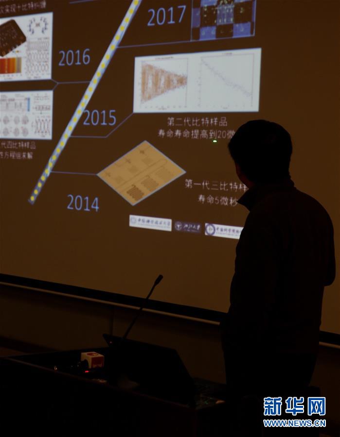 2017年5月3日,中國科學技術(shù)大學潘建偉院士在上海宣布,我國科研團隊成功構(gòu)建的光量子計算機,首次演示了超越早期經(jīng)典計算機的量子計算能力。這是潘建偉院士在介紹“超導(dǎo)量子計算機路線圖”。 新華社記者 金立旺攝