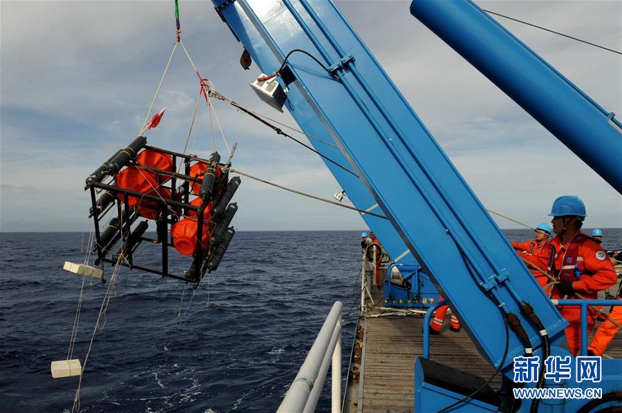 考察隊(duì)員將負(fù)責(zé)拍攝和誘捕生物的“彩虹魚(yú)”第二代著陸器布放到海里(12月10日攝)。 由上海海洋大學(xué)和西湖大學(xué)聯(lián)合組成的“彩虹魚(yú)”科考團(tuán)隊(duì),12月11日在全球最深的海溝——馬里亞納海溝成功完成兩臺(tái)“彩虹魚(yú)”第二代著陸器的萬(wàn)米級(jí)海試,深度分別為10918米和10899米。 新華社記者 張建松 攝