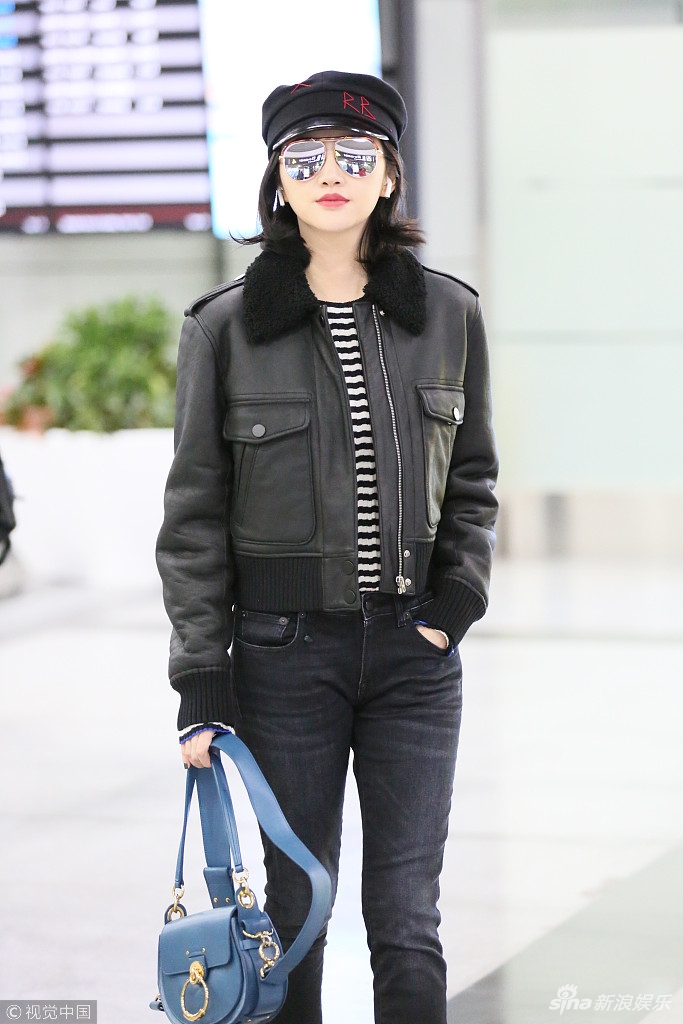 日前,景甜現(xiàn)身機(jī)場(chǎng),身穿黑色皮夾克超有范兒,戴小帽酷似甜美女軍官。視覺(jué)中國(guó)/圖