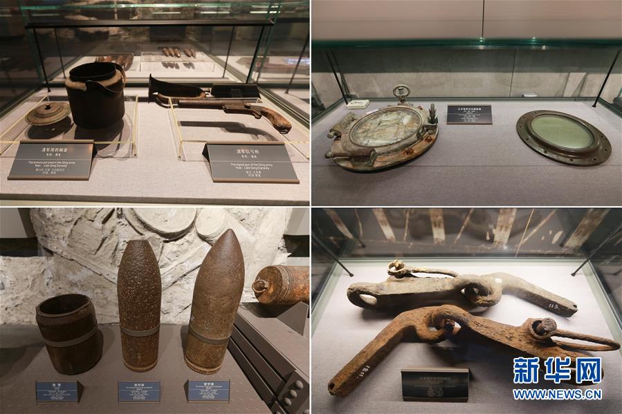 這是一張拼版照片,左上圖為:在甲午戰(zhàn)爭陳列館內(nèi)展出的清軍用的銅壺和信號槍;右上圖為:在甲午戰(zhàn)爭陳列館內(nèi)展出的北洋海軍濟(jì)遠(yuǎn)艦舷窗;左下圖為:在甲午戰(zhàn)爭陳列館內(nèi)展出的炮彈和穿甲彈;右下圖為:在甲午戰(zhàn)爭陳列館內(nèi)展出的北洋海軍艦用拋錨鉤(12月8日攝)。 新華社記者王南攝