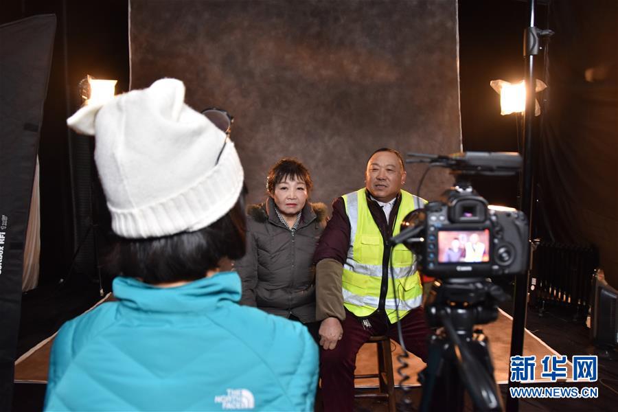 攝影師羅嫻在工地上搭建的臨時攝影棚內(nèi)指導(dǎo)農(nóng)民工夫妻擺姿勢(12月10日攝)。  新華社記者 白田田 攝