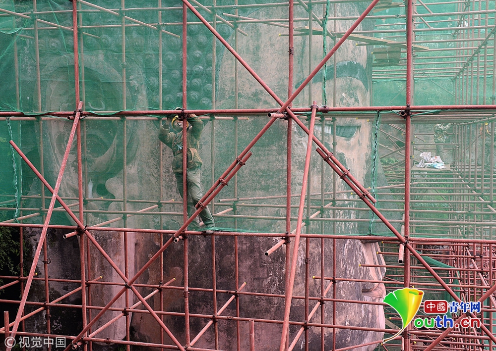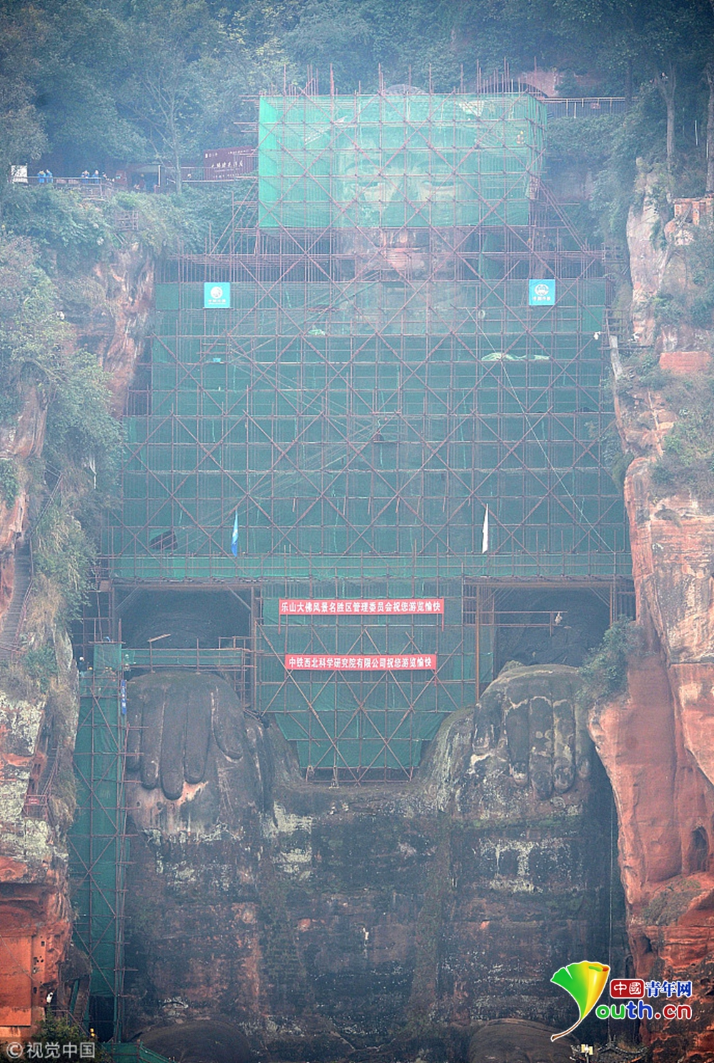 12月10日前后已逐步遮蔽大佛頭部,對(duì)頭面部進(jìn)行勘測(cè);12月底將開(kāi)始拆除頭部腳手架,保證2019年元旦節(jié)之前,先露出佛頭,供游客觀賞。