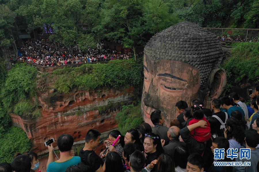 10月4日,游客在樂山大佛前排隊(duì)一睹大佛真容(無人機(jī)拍攝)?!⌒氯A社記者 江宏景 攝