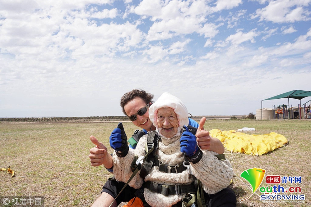 12月14日消息,澳大利亞一名102歲高齡的老奶奶日前刷新世界紀錄,她跟著教練從1萬4000英尺(約4300公尺)的高空一躍而下,成為全球最年長的跳傘玩家。