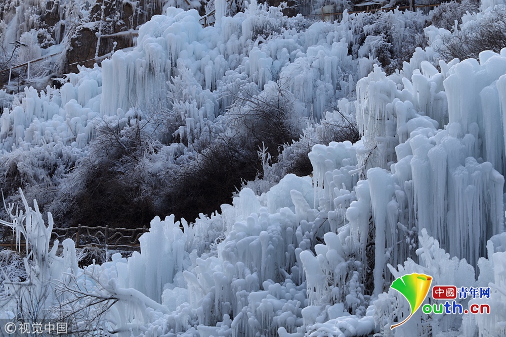 炭廠村神泉峽景區(qū)大面積人工冰瀑形成美麗的冰瀑景觀,預(yù)計(jì)12月19日正式向游客開(kāi)放。