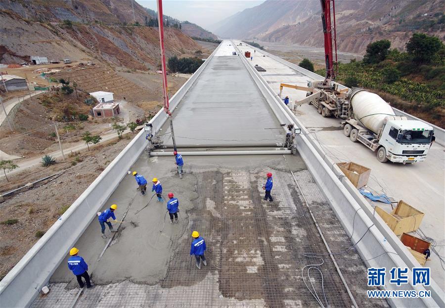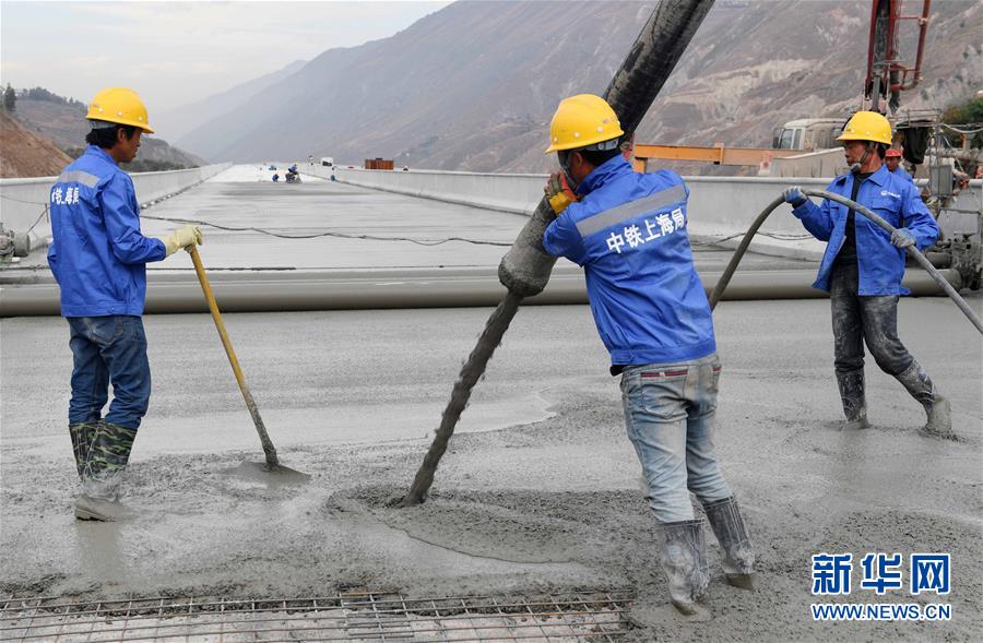12月15日,中鐵上海局集團(tuán)公司的施工人員在東格高速公路土建項目中進(jìn)行橋面鋪裝作業(yè)。新華社記者楊宗友攝