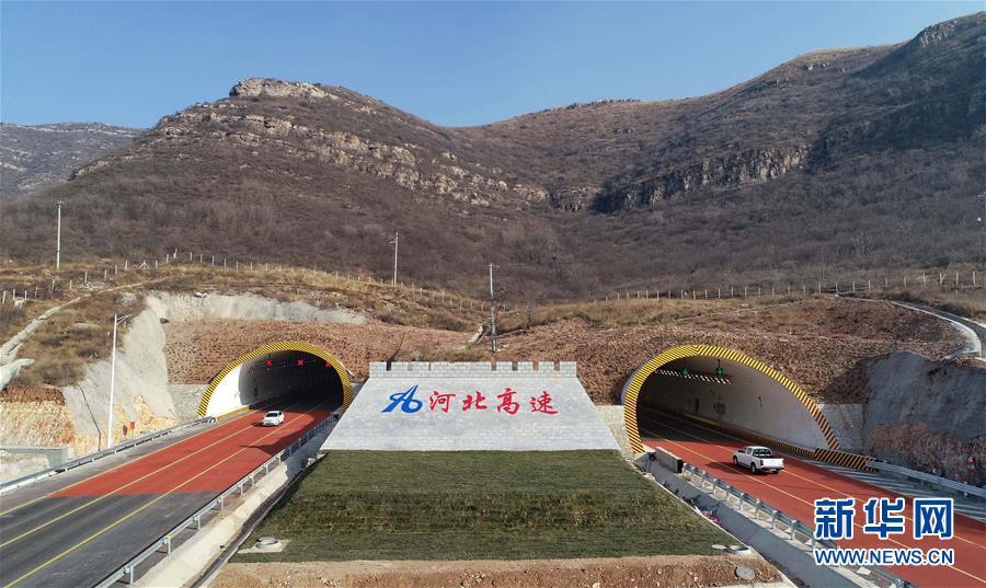 12月16日,兩輛汽車行駛在京秦高速公路二期工程河北玉田境內(nèi)的鳳凰頂隧道路段(無人機拍攝)。 新華社記者楊世堯攝