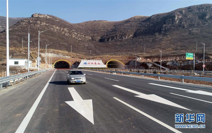 12月16日,一輛汽車行駛在京秦高速公路二期工程河北玉田境內(nèi)的鳳凰頂隧道路段(無人機拍攝)。