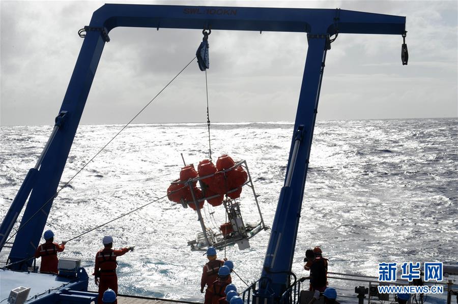 考察隊(duì)員在馬里亞納海溝“挑戰(zhàn)者深淵”海域布放“彩虹魚”著陸器(12月14日攝)。