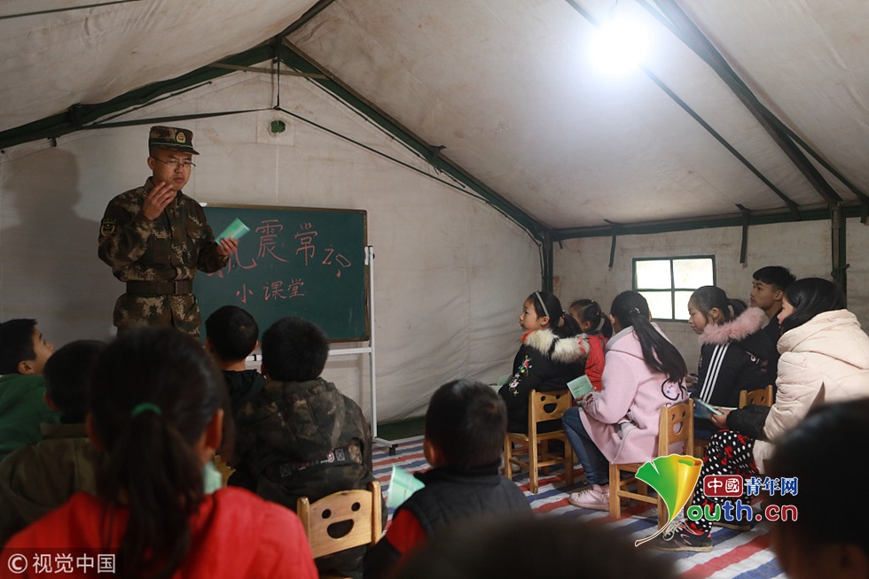 2018年12月18日,四川宜賓。武警宜賓支隊政治工作處宣傳保衛(wèi)股股長朵祝偉為周家鎮(zhèn)新塘安置點的“帳篷學(xué)?!钡膶W(xué)生上抗震常識課。圖片作者:謝江、劉崇達/視覺中國