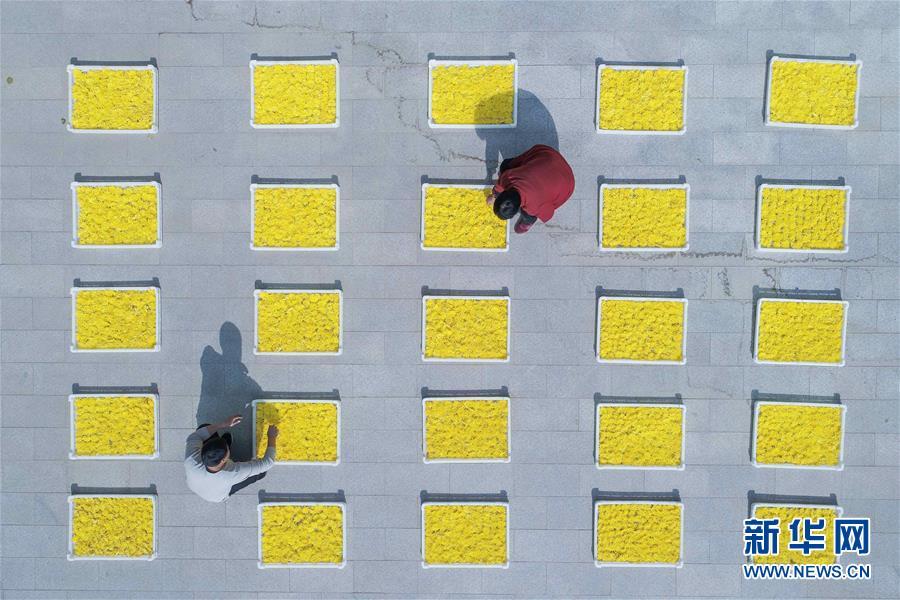 2018年11月7日,河北省魏縣魏城鎮(zhèn)町上村農(nóng)民在分揀晾曬菊花。 大地之色,俯仰之間;壯美山河,是我的祖國(guó)。2018年,新華社記者操縱無(wú)人機(jī)“飛閱”華夏大地,在最美的時(shí)節(jié),定格下她的色彩斑斕。 新華社記者 朱旭東 攝
