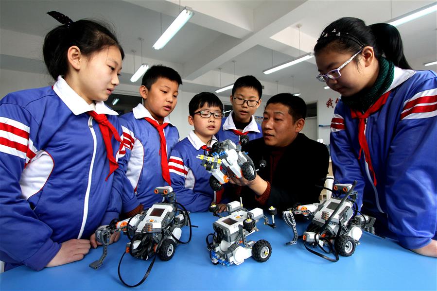12月19日,武安市淑村鎮(zhèn)白沙學(xué)校的學(xué)生在練習(xí)操作機(jī)器人。新華社記者王曉攝