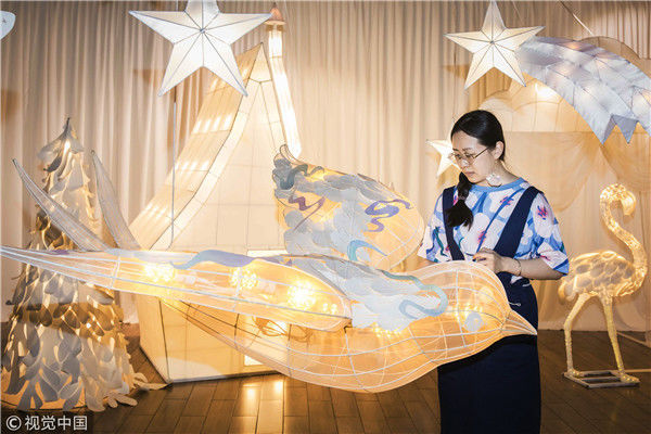 2018年5月6日,廣州,在天河區(qū)一家大商場辦個展時,用紙片做成的北極熊、大松樹、火烈鳥、紙房子在光線的配合下美輪美奐,吸引了很多顧客駐足。“幾乎每個人一看到,都會走進(jìn)那個夢幻的場景里,和這些紙雕一起合影。”圖片攝于2018年5月6日。南塘/視覺中國