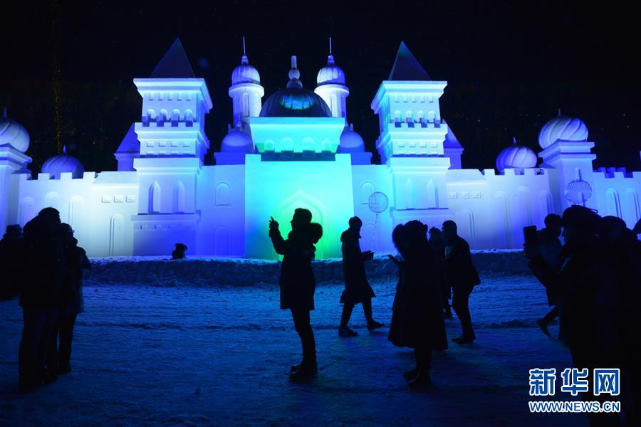 12月21日,游客在冰雪節(jié)開幕式上走過雪雕城堡。新華社記者鄒予攝