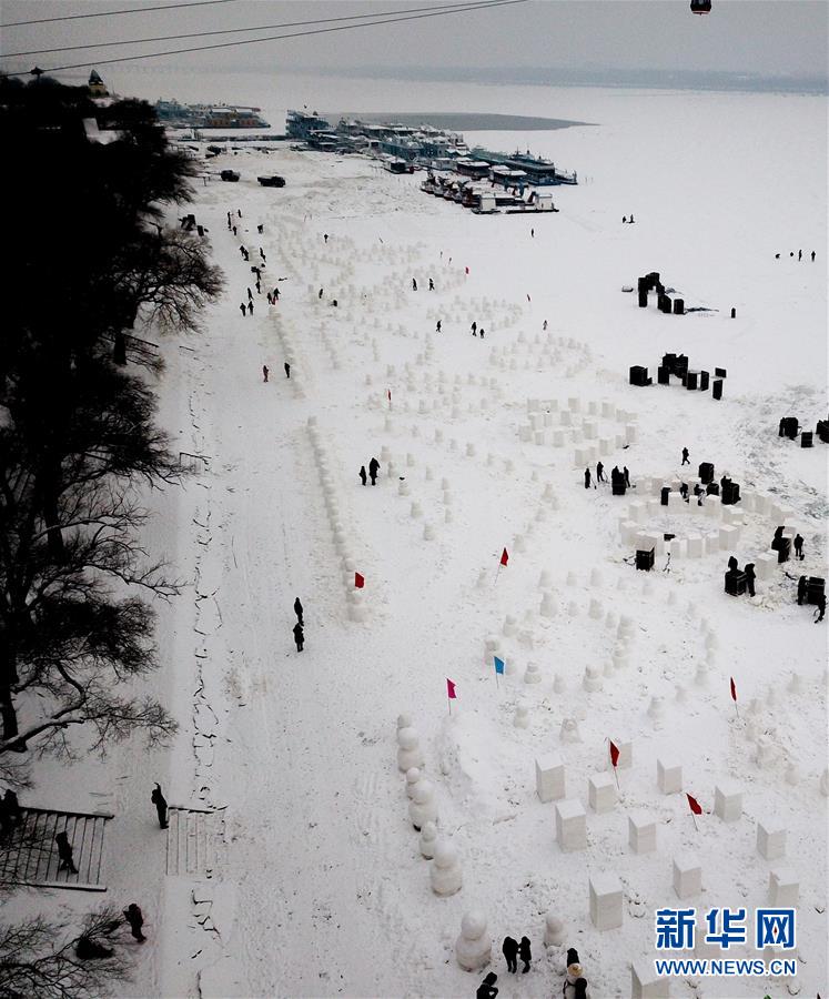 在松花江哈爾濱段江面上,制作中的部分雪人(12月21日無人機拍攝)。新華社記者王松攝