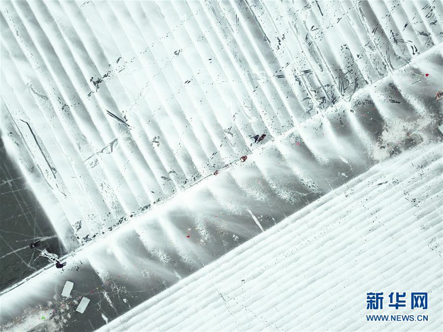 在松花江哈爾濱段江面,工人們在進行切割和采冰工作(12月12日無人機拍攝)。 黑龍江哈爾濱市的冰雪主題樂園哈爾濱冰雪大世界的采冰和建設(shè)工作近日拉開帷幕。為保證足夠的優(yōu)質(zhì)冰供給,每天有近千名采冰人和700多輛運冰車參與到采冰工作。 新華社記者 王松 攝