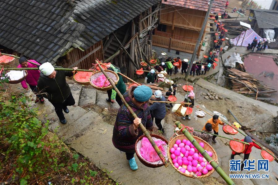 為慶祝小孩滿(mǎn)月,父母帶著送禮隊(duì)伍拜望外公外婆(2月24日攝)。