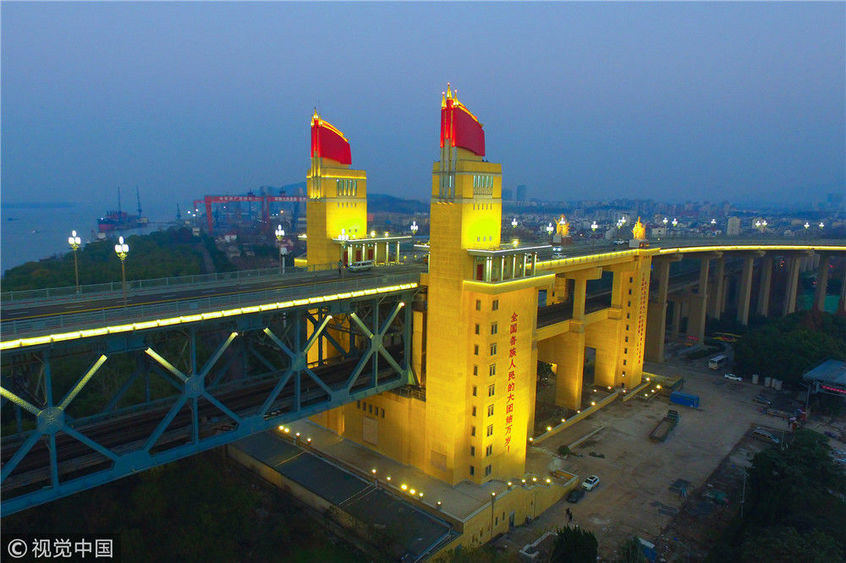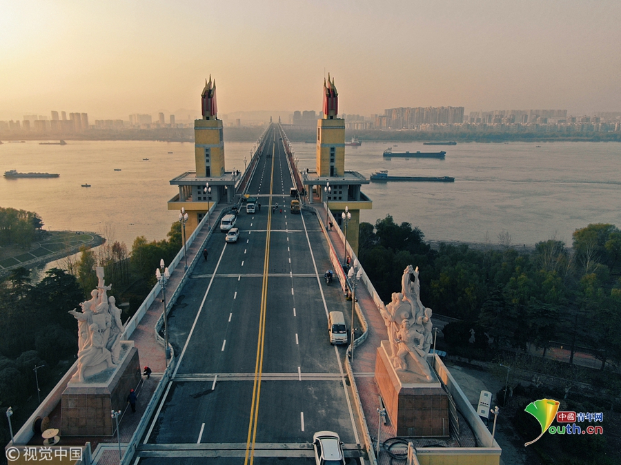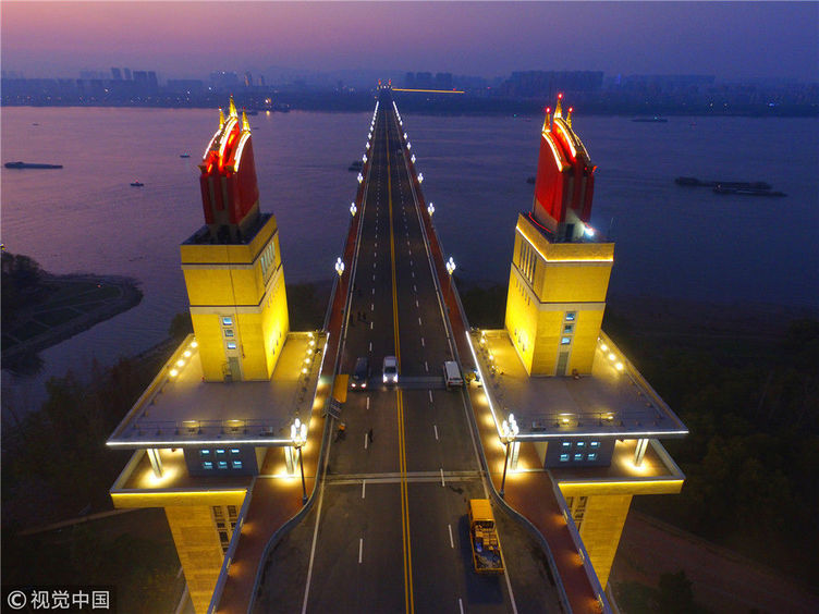 2018年12月13日,江蘇南京,“一橋飛架南北,天塹變通途?!弊鳛槲覈?guó)第一座自行設(shè)計(jì)和建造的雙層鐵路、公路兩用橋,南京長(zhǎng)江大橋在我國(guó)橋梁史上的重要地位不言而喻。從1968年建成后的48年間,它就如同一條巨龍,始終在長(zhǎng)江上默默守護(hù)著人來(lái)車往。南京長(zhǎng)江大橋上層是公路橋,下層為雙軌復(fù)線鐵路橋,連接津浦鐵路與滬寧鐵路干線,是我國(guó)南北交通要津和命脈。近年來(lái),由于南京長(zhǎng)江大橋公路橋的實(shí)際通行荷載遠(yuǎn)超原先設(shè)計(jì)標(biāo)準(zhǔn),不僅橋面上擁堵?,F(xiàn),橋梁本身的種種“病害”也日益加深。圖為2018年12月13日,夜幕降臨,南京長(zhǎng)江大橋歸位后的玉蘭花燈重新點(diǎn)亮。大橋玉蘭花燈柱共有299根,每根燈柱上有5盞玉蘭花燈,1大4小,一共1495盞。方東旭/視覺(jué)中國(guó)
