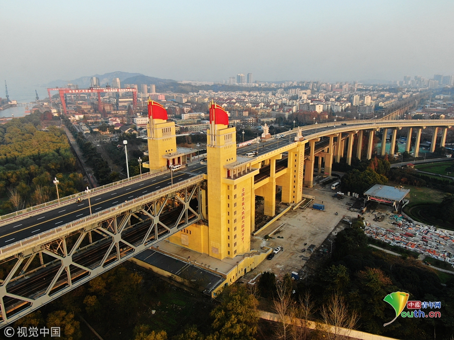 2017年9月19日,南京長(zhǎng)江大橋正橋的混凝土面板已經(jīng)全部拆除,僅剩交錯(cuò)縱橫的鋼桁架橫跨在長(zhǎng)江之上,從高空俯瞰猶如一條“鋼鐵巨龍”。