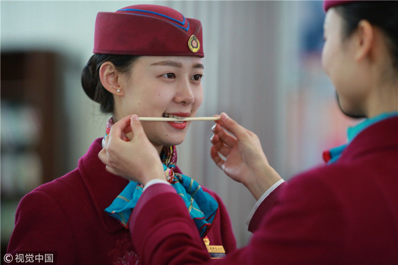 2018年12月27日,四川成都,為備戰(zhàn)即將開通的成雅鐵路,中國鐵路成都局集團有限公司成都客運段動車二隊對成雅動車的乘務人員進行理論、形體、服務禮儀等內容的培訓。