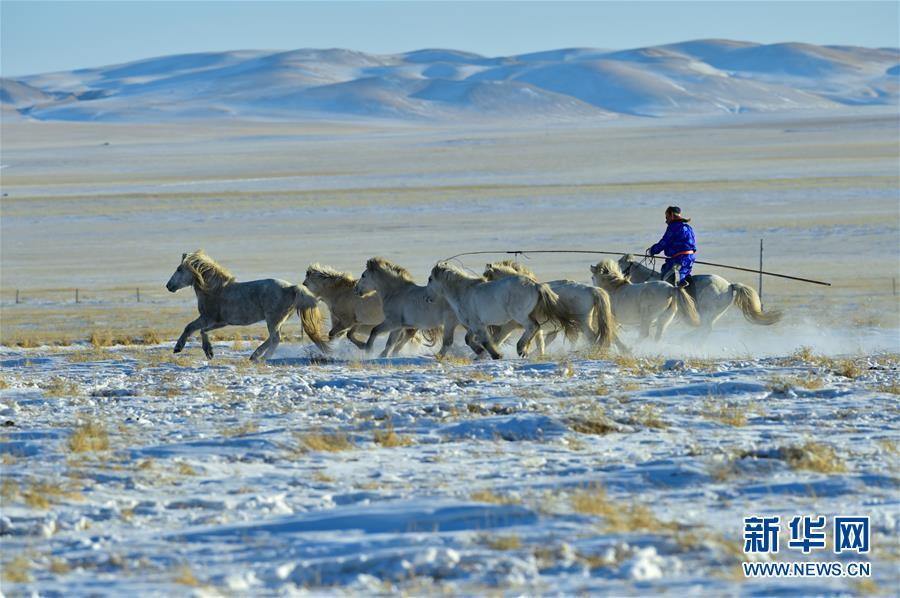 1月8日,牧民進(jìn)行套馬表演。 時(shí)下正值草原冬季旅游旺季,內(nèi)蒙古自治區(qū)西烏珠穆沁旗的牧民們?cè)谘┰弦徽股硎郑瑸橛慰驼宫F(xiàn)獨(dú)特的民族風(fēng)情。 新華社記者 鄒予 攝