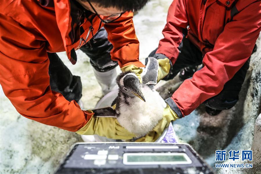 1月9日,馴養(yǎng)員給白眉企鵝寶寶稱(chēng)重。