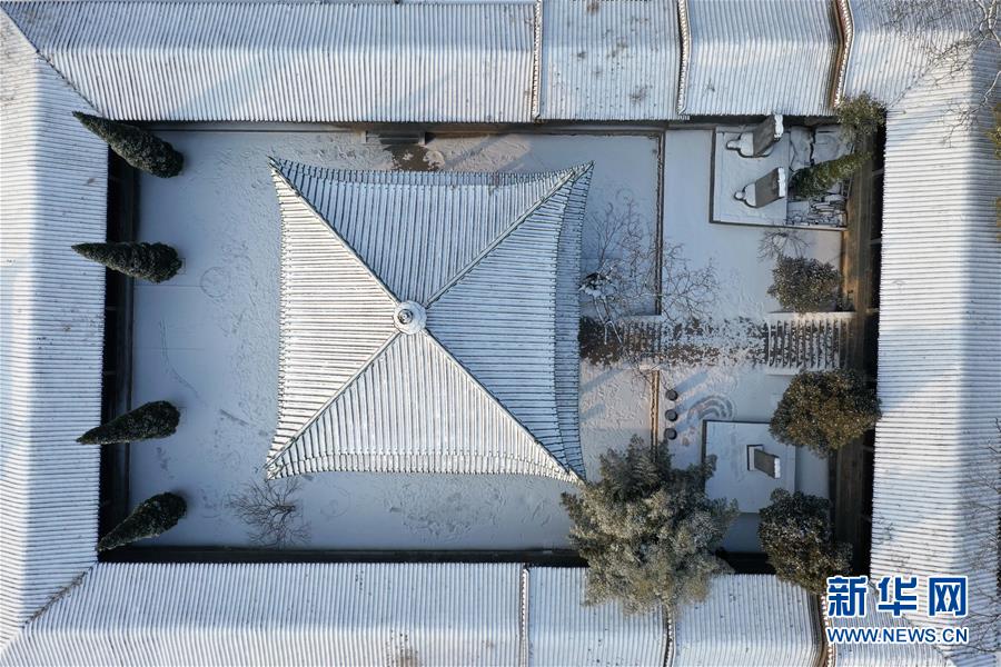 1月10日無(wú)人機(jī)拍攝的少林寺一景。當(dāng)日,雪后初霽,河南登封少林寺分外秀美。 新華社記者 馮大鵬 攝