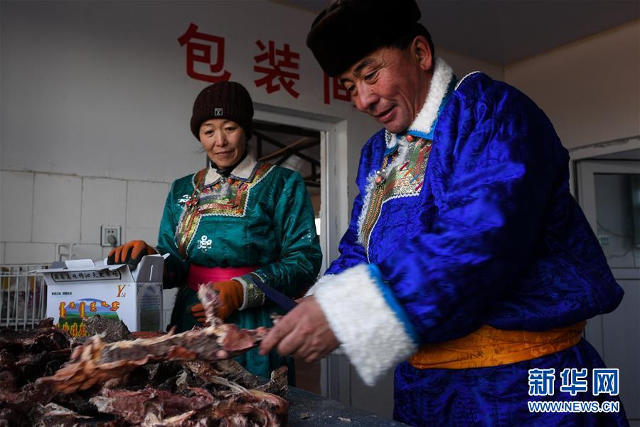 1月9日,牧民伊拉代(右)和妻子斯琴高娃在分割已經(jīng)風(fēng)干好的牛肉。新華社記者 劉磊 攝