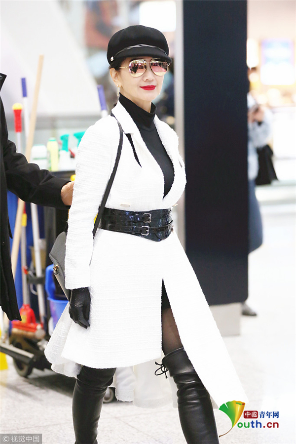 1月10日,廣東省深圳市,趙雅芝夫婦現(xiàn)身深圳寶安機(jī)場,頭戴貝雷帽的她架著反光墨鏡,一襲白色不規(guī)則連衣裙配上黑色腰封及皮靴,酷似甜美女教官!