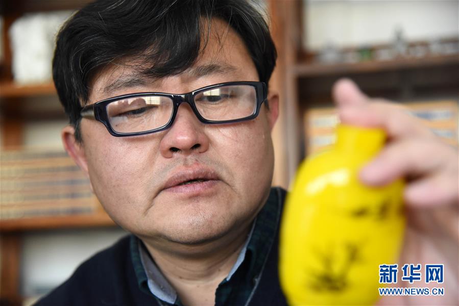 1月12日,孫云毅在查看一只剛剛畫(huà)完的雞油黃鼻煙壺。  新華社記者王凱攝