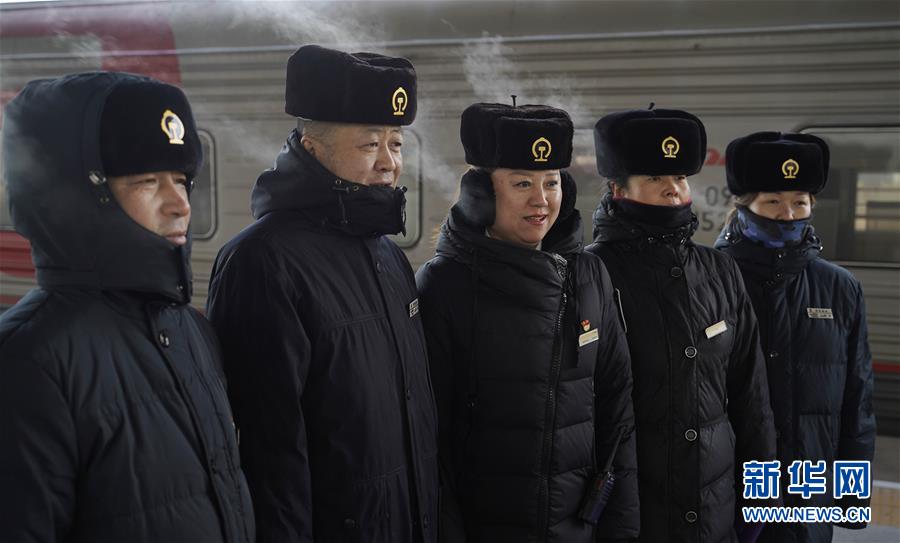 1月11日,在滿洲里火車站站臺,“金鑰匙”服務臺客運員在嚴寒中等待列車進站。