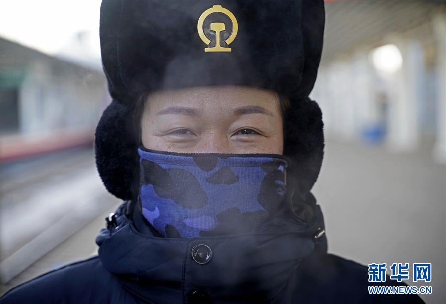 1月11日,在滿洲里火車站站臺,由于氣溫近零下30攝氏度,“金鑰匙”服務臺客運員“呵氣成霧”。